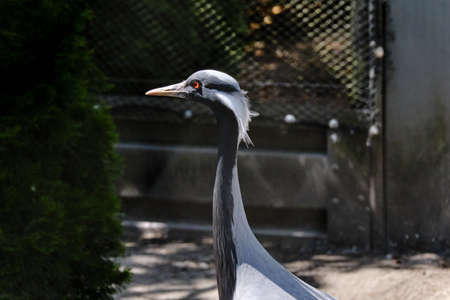 Beautiful head of a gray crane, in sideview, long white hair at the backside of head.