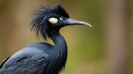A detailed portrait of a unique black bird, showcasing its spiky crest, long beak, and piercing blue eye against a soft, blurred background.