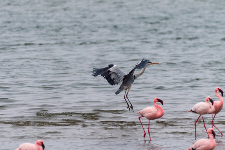 blue Heron landing amid a group of Greater Flamingos - Phoenicopterus roseus- along the shores of Walvis Bay, Namibia.