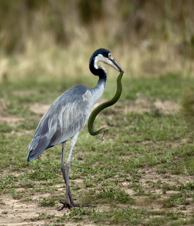 Black-headed heron (Ardea melanocephala) caught snake in Ngorongoro Crater, Tanzania