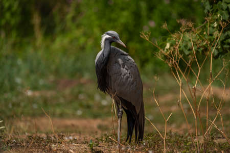 Demoiselle Crane, Anthropoides virgo are living in the bright green meadow during the day time. It is a species of crane found in central Eurosiberia