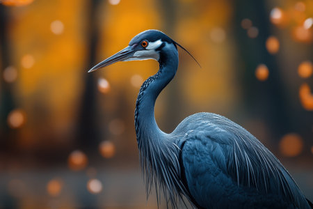 A heron stands gracefully near colorful autumn foliage, illuminated by the warm glow of the sunset. The detailed plumage contrasts against the vibrant orange and yellow leaves.