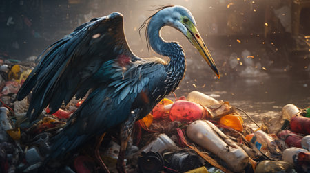 Close up of a great blue heron (Ardea herodias) standing in the trash.
