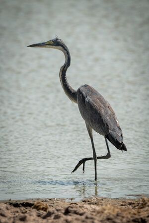 Grey heron stands lifting leg in pond