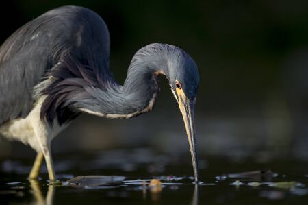 A Tricolored Heron stalks the shallow water in the early morning sun with a dark background and dramatic lighting.