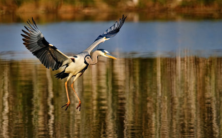 Blackheaded heron taking off in search of food with blurred reeds in the background