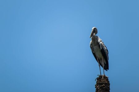 Cute Asian openbill or Asian openbill stork bird (Anastomus oscitans) on top of a coconut tree stump