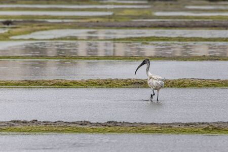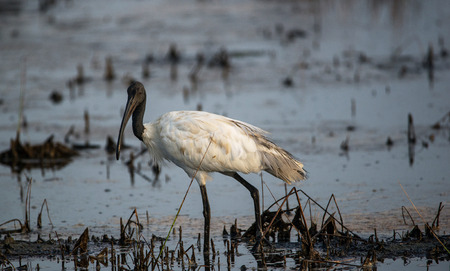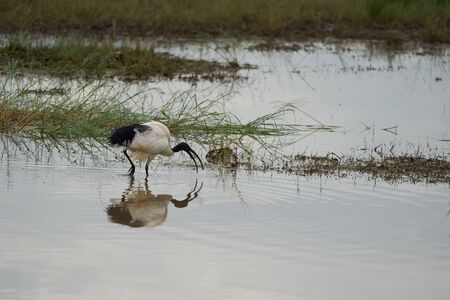 Single Black-headed ibis Threskiornis melanocephalus finding food in nature of Thailand