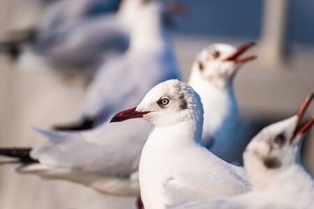 Four Seagulls standing at Sukta Bridge, Bangpu, Samut Prakan, Province, Thailand, Larus brunnicephalus, Close up shot, Select focus, Birds photography travel