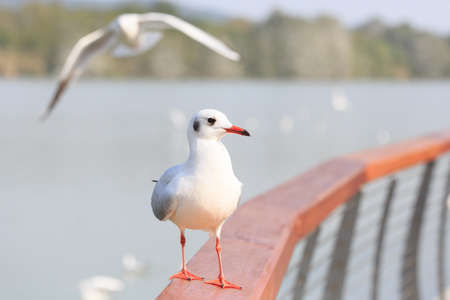 Seagull standing on a bridge, background, flocks of seagulls flying.at Bangpoo, Thailand.