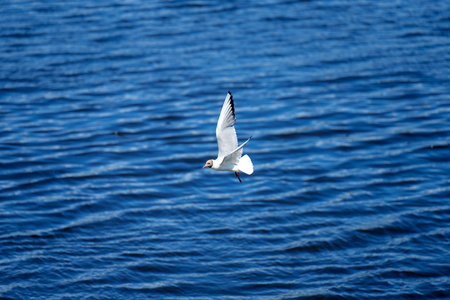 A black-headed gull Chroicocephalus ridibundus in flight against a clear blue sky, showcasing its white body, black-tipped wings, and distinctive red beak.