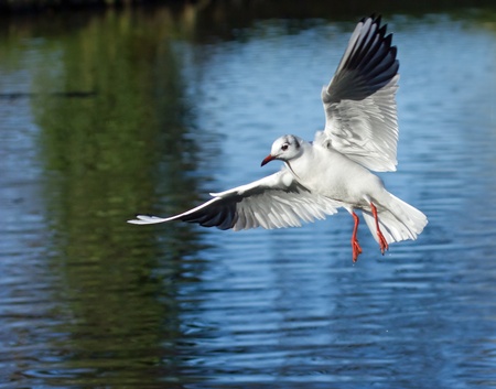 Black-headed Gull flying low over water