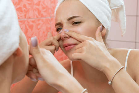 Young woman looking and squeeze acne on a face in front of the mirror. Ugly problem skin girl, teen girl having pimples. Skin care. Beauty