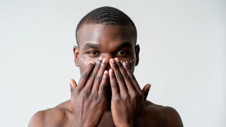 Male cosmetic. Skin moisturizing. Confident shirtless man applying face anti aging treatment skincare cream under eyes isolated on white background.