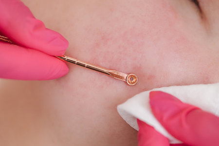 Squeezing acne from a girl with problem skin in the salon using a loop.