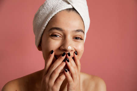 Annoyed woman squeezes out pimples on her face and a towel on her head gray background cosmetology dermatology
