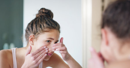 Girl, pimple and skincare in mirror, bathroom and check for zit, acne and morning routine at family home. Teenager, face and dermatology with reflection, cosmetics or insecure for beauty at apartment