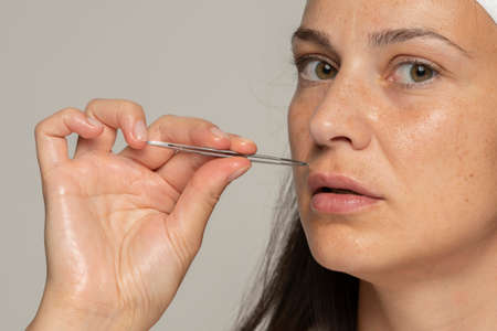 a young beautiful woman squeezes pimples on her forehead on a white background