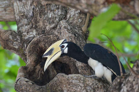 A picture of oriental pied hornbill waiting to be feed at Pangkor island during evening. It is medium size frugivore with a head-to-tail length of 55–60 cm and a wingspan of 23–36 cm.