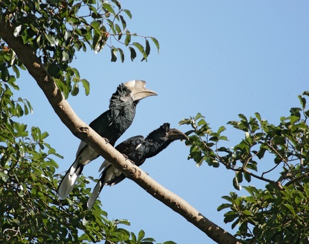 a male and a female bird named Silvery-cheeked Hornbill on a bough in Uganda (Africa)