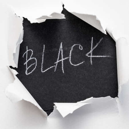 hole in paper with rough curled edges. background square with written word black bursting through white layer.