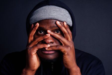 worried young african american mele wearing gray hat and black hoody with hood hiding from the rapist s blow attacker studio black dackground