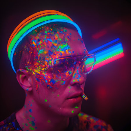 A man in a neon-lit environment has his face and neck covered in bright, multicolored fluorescent paint splatters. He wears large, transparent glasses, and a halo-like headband with glowing neon rings of orange, green, and blue. A lit cigarette is clenched between his lips, and the vivid lighting casts a striking glow on his features, emphasizing the vibrant paint and creating an energetic, edgy atmosphere.