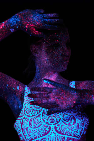UV body art on the face of a very beautiful girl with a lush hairstyle on a dark background. Space figure