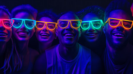 Step into a neon-drenched world of cyberpunk fashion Friends, adorned in glowing costumes, celebrate the future with a futuristic flair Vivid lights dance across the scene, creating an electrifying atmosphere Prepare for a night of vibrant energy and cutting-edge style AI Generative