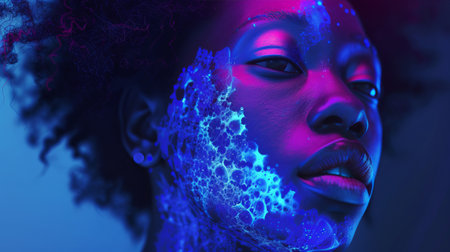 photo of beautiful african woman with with mixed pink and blue neon light, generative AI