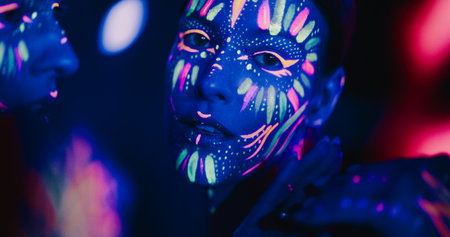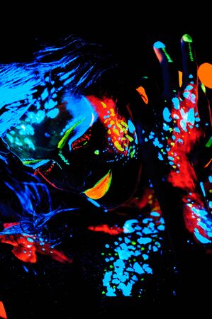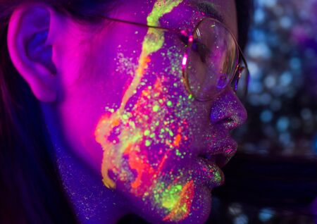 Model woman in neon light, beautiful model girl with fluorescent makeup, art design of disco dancer dancing in uv light, colorful makeup. nightclub, party
