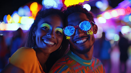 Happy couple wearing fluorescent costume smiling at night party