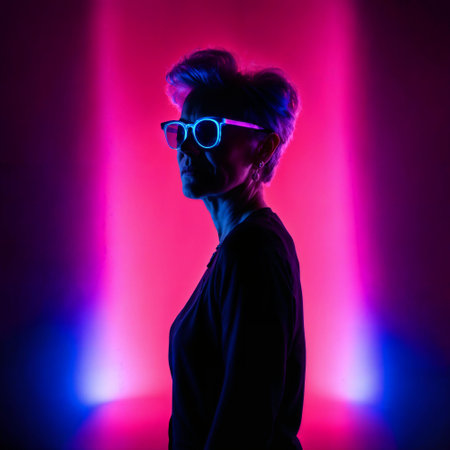 photo of middle aged old woman with with mixed pink and blue neon light, generative AI