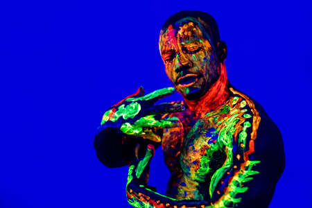 Portrait of a pumped-up man at a disco. Fluorescent paint on face in with UV light.