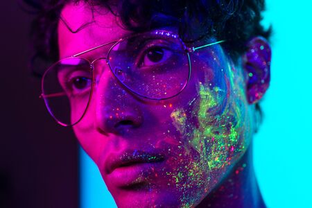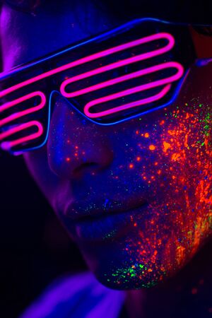 Handsome boy dancing at the rave party with fluorescent paintings on his face