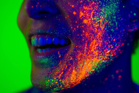 Portrait of Beautiful Fashion Woman in Neon UF Light. Model Girl with Fluorescent Creative Psychedelic MakeUp, Art Design of Female Model in UV, Colorful Abstract Make-Up