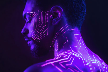 Artistic portrait of a young man with fluorescent circuit lines body painting illuminated by a black light