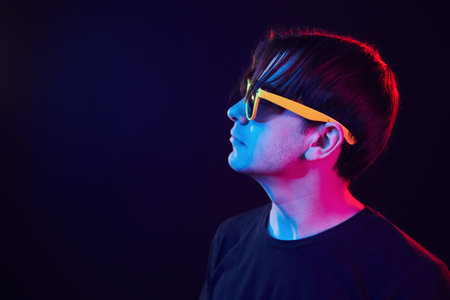 In yellow sunglasses. Man standing in the studio with neon light.