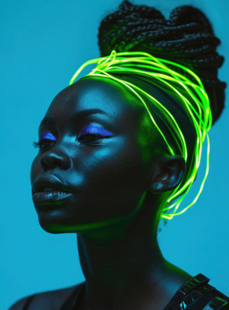 African woman with neon green hair and makeup on blue background vibrant beauty portrait with colorful style
