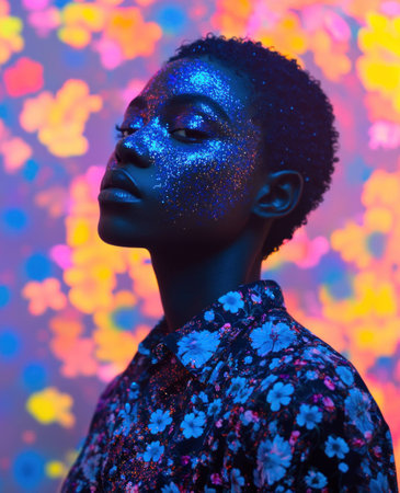 Stylish African woman with glitter makeup posing against a colorful floral background. Vibrant and artistic concept highlighting beauty and self-expression.
