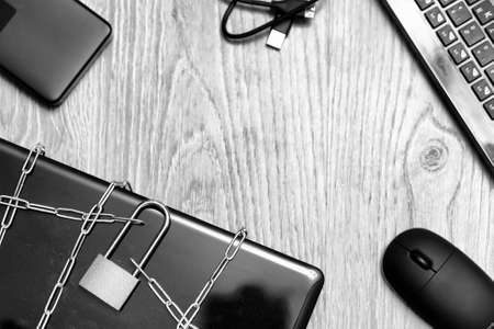 Cyber protection and security concept. Internet hacked computer server, database, network storage, firewall, social network account. 011