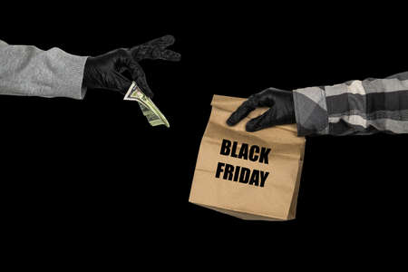 crime concept man in black leather gloves holding pile of money