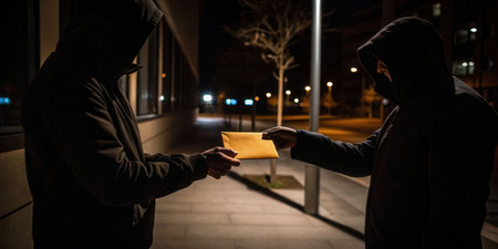 Illegal pack exchange at night in dimly lit urban area concealed dealings under mysterious shadows
