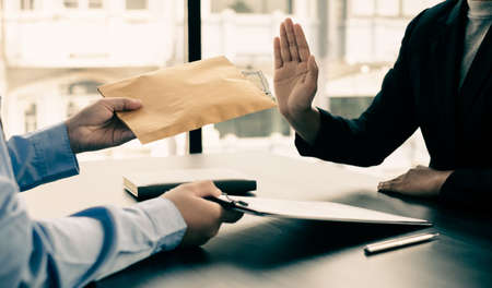Bribery and corruption concept, Businessman refusing receive money in the envelope to agreement contract, A bribe in the form of dollar bills.