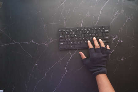 A man in black gloves with dollars money in his hands at a computer keyboard in a dark night office, close-up