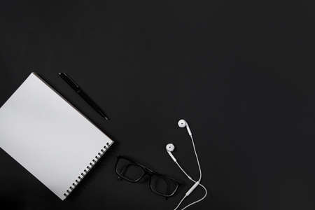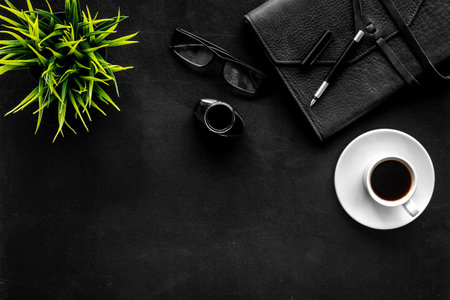 Flat lay of black office desk table with notebook, pen, coffee cup and other items. Top view with copy space