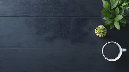 A white mug of black coffee sits next to a small potted succulent on a dark wooden desk. The overhead shot creates a clean and modern aesthetic.