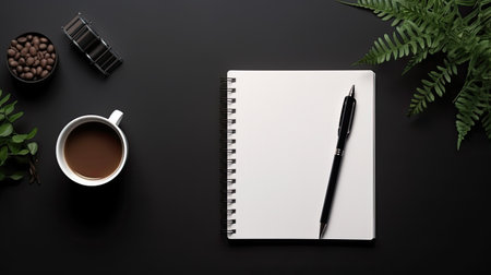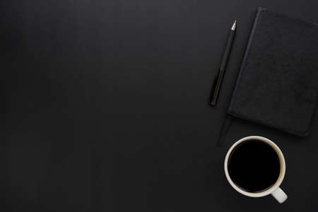 Top view above of dark black office desk table with notebook and coffee cup with a pen. Business and finance concept. Workplace, Flat lay with blank copy space.