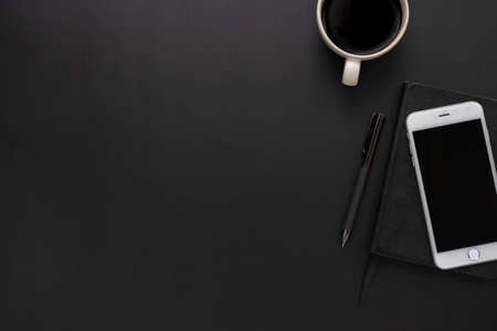 Top view above of Black office desk table with mobile phone, notebook and coffee cup with equipment other office supplies. Business and finance concept. Workplace, Flat lay with blank copy space.