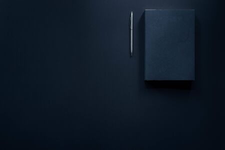 Blank black notebook on a black table, mockup photo. Blank black cover template with copy space for design. Black on black, minimal design concept.